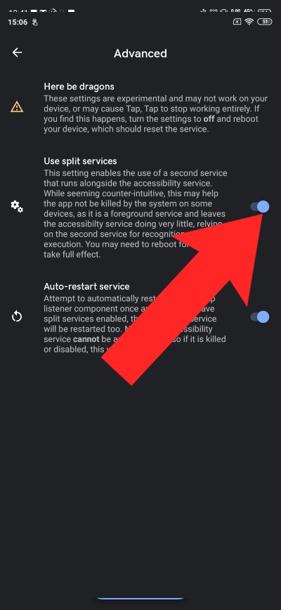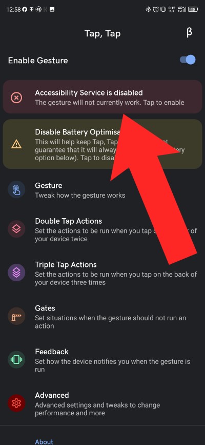 Po otvorení aplikácie, aby dotykové gesta fungovali korektne, tak si otvorte sekciu „Accessibility Service is Disable“. Následne aplikácii udeľte potrebné oprávnenia. Zároveň vám odporúčame vypnúť optimalizáciu využívania batérie zariadenia (ide o sekciu Disable Battery Optimisation). V rámci aplikácie otvorte ešte sekciu Advanced a aktivujte funkcie, ako môžete vidieť na 3. obrázku nižšie. Pomocou týchto nastavení nebude dochádzať k vypínaniu chodu aplikácie na pozadí.
