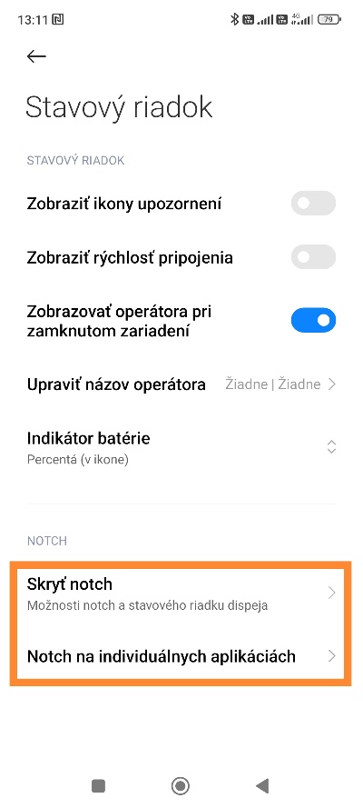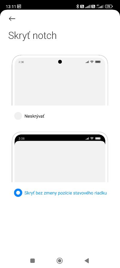 - Ak chcete notch skryť úplne, zvoľte možnosť Skryť notch